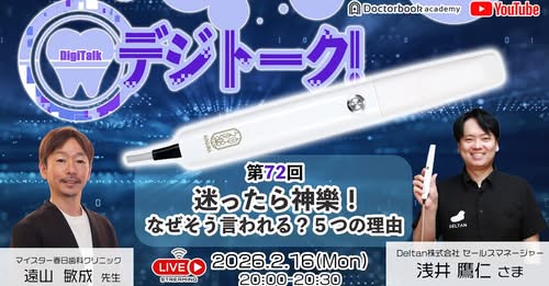 ゲストにDeltan株式会社 浅井鷹仁様をお迎えし、コストパフォーマンスに優れたIOS(口腔内スキャナー)「神樂(カグラ)」の性能を、実演を交えながら検証していきます。